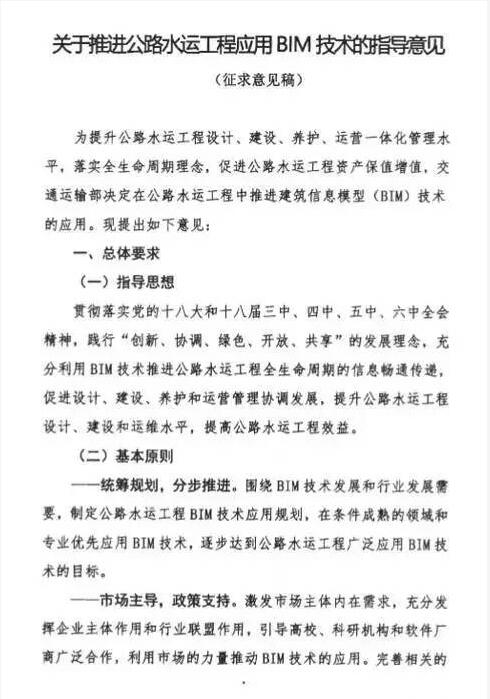 近日,交通運輸部公路局對各省(自治區、直轄市)交通運輸廳(局、委)等單位發布了《關于推進公路水運工程應用BIM技術的指導意見》,征求各單位意見(見附圖)。